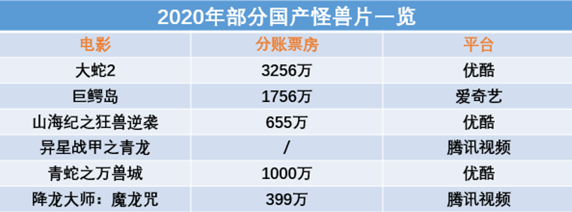 值得一提的是,盡管2020年的網絡電影市場中出現了不少類型、題材各異的高票房作品,但就各平臺發布的榜單來看,玄幻、魔幻等元素仍是市場主流。而在這些類型分支下,怪獸片作為一個亞類型題材,顯然有著其自身優勢,將具有一定視覺沖擊力的“奇異巨獸”與奇幻、驚悚乃至懸疑等類型元素進行有效嫁接,也是這類電影持續走紅的原因。而自2018年《大蛇》誕生以來,曾經不受追捧的怪獸片已經逐漸被市場接納,并屢次創造票房佳績。