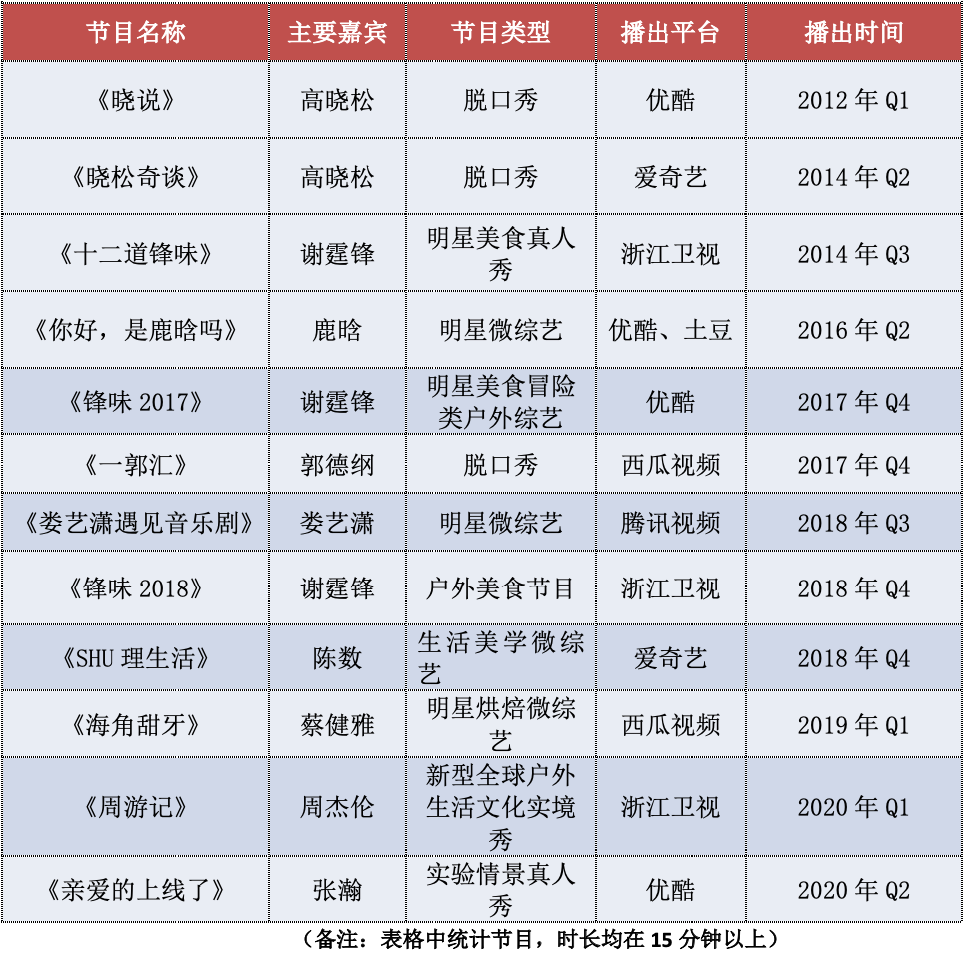 從上表來看,早期的個人綜藝多以脫口秀節目為主,直到2014年,由謝霆鋒擔任主廚的美食類綜藝《十二道鋒味》在浙江衛視播出后,才讓明星個人綜藝逐漸在市場上活躍起來。