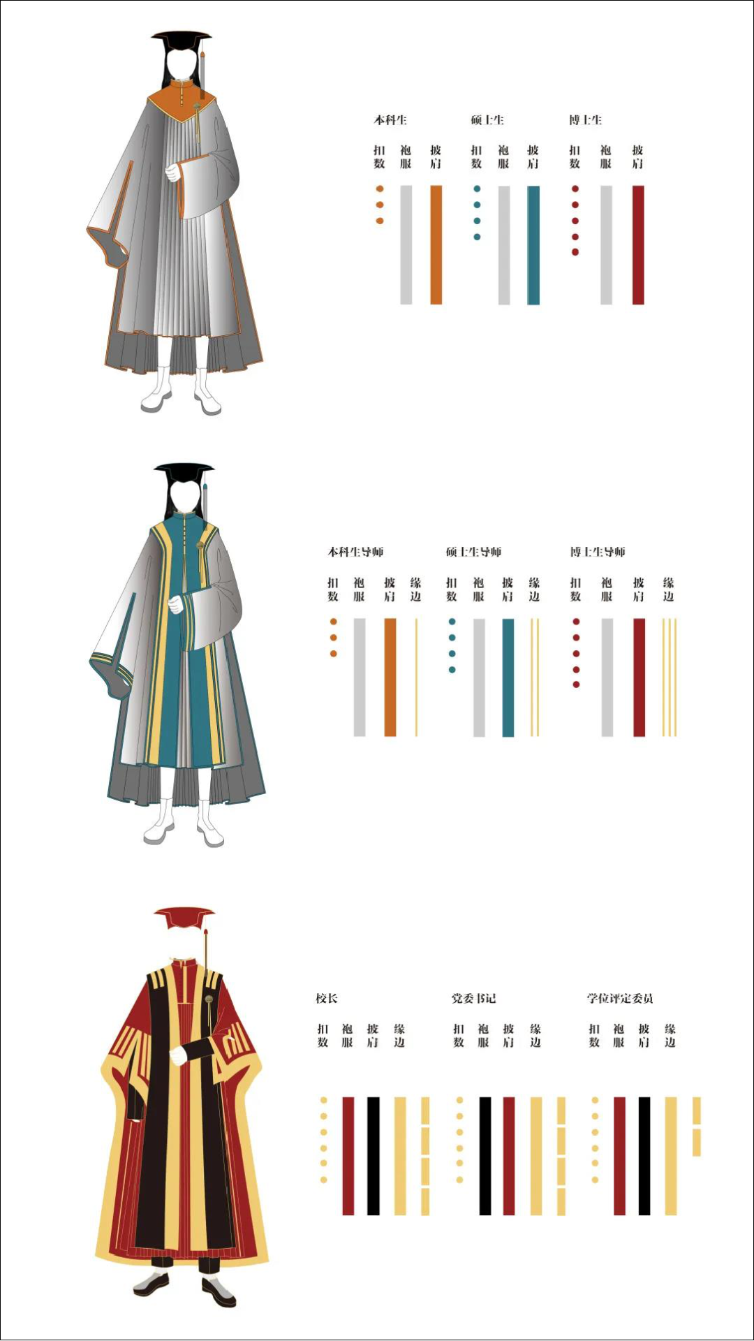 中央美院設計學位服分為:學士學位服、碩士學位服、博士學位服。每種學位服設計都各具特色。