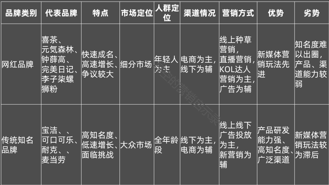 網(wǎng)紅品牌和傳統(tǒng)知名品牌的差別主要有以下幾點(diǎn),大部分都在前述內(nèi)容闡述過了,這里主要說一下網(wǎng)紅品牌相對傳統(tǒng)知名品牌的優(yōu)劣勢。