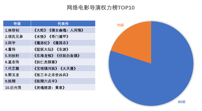 在不久前公布的網絡電影導演權力榜中,TOP10榜單的8位導演均為80后,其中有7位導演為85后。在這其中,既包括執導了《大蛇》系列、《倩女幽魂:人間情》等知名作品的林珍釗,以及執導了《奇門遁甲》《水怪》的項氏兄弟,還包括劉軒狄、代藝霖、陳翔等一些作品數量較少但曾產出頭部作品的青年導演,他們所拍攝的作品或在行業內具有一定創新意義,或在票房上有過杰出表現。