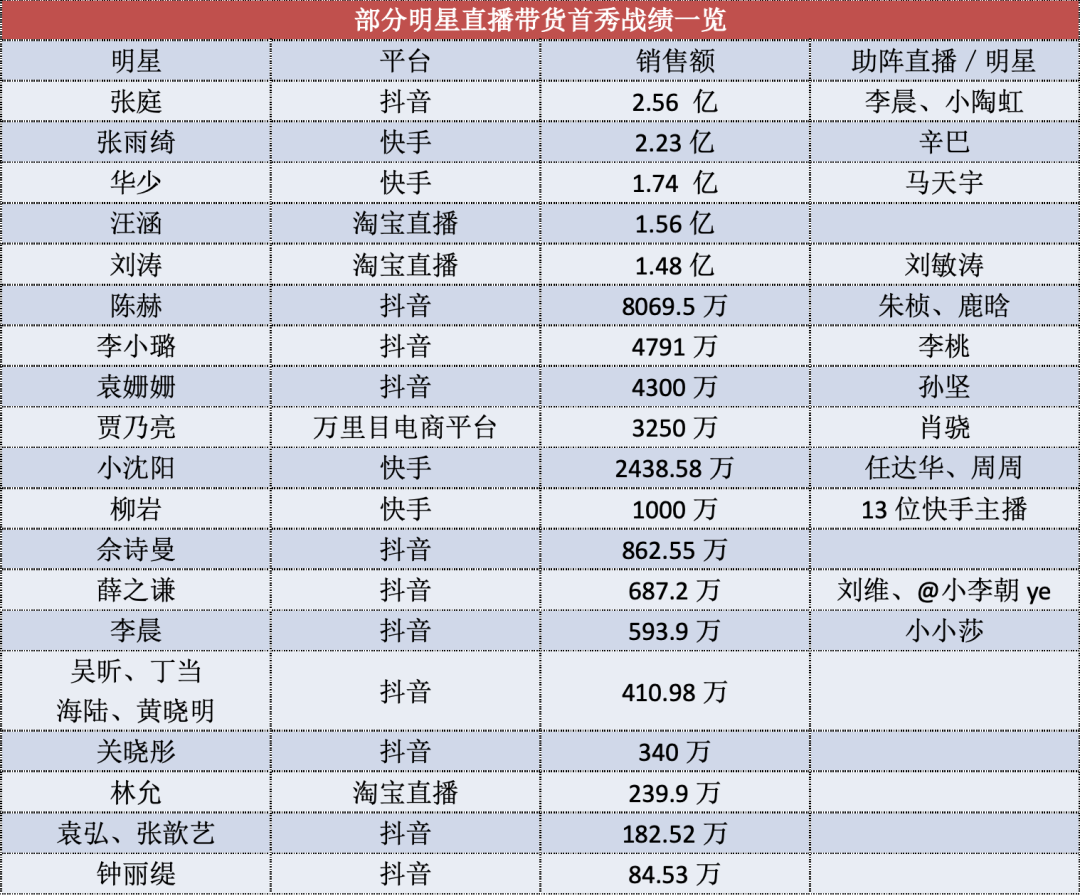 明星的加入,在一定程度上確實起到了拉動流量,實現銷售轉化的作用。下表中梳理了明星直播帶貨的首秀戰績,其中已在電商行業打拼多年的張庭拔得頭籌,張雨綺、華少、汪涵、劉濤等明星也創造了首秀銷售額超萬億的成績。