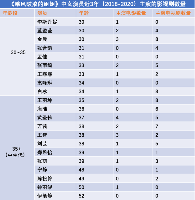據(jù)影視產(chǎn)業(yè)觀察統(tǒng)計,《乘風(fēng)破浪的姐姐》邀請的嘉賓中本職是演員的比例占到了近70%,在這其中年齡為35+的嘉賓超過半數(shù)。對于大部分觀眾而言,這些已經(jīng)在影視圈摸爬滾打多年的女演員并不陌生,甚至對于她們此前主演的作品如數(shù)家珍,但正如網(wǎng)友所調(diào)侃的“偶像愛豆都去演戲了,女演員被迫只能再次‘出道’”,對于這些中生代女演員來講,在男頻內(nèi)容受寵和偶像大行其道的雙重壓力下,能給予她們的機會終究有限,于是也造成了多數(shù)中生代女演員面臨“無戲可拍”的境況。