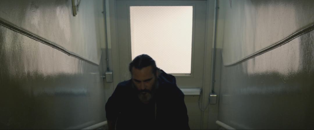 在影片開(kāi)拍前,導(dǎo)演琳恩·拉姆塞給喬的扮演者華金·菲尼克斯發(fā)了很多煙花爆炸的音頻,并告訴他,這就是喬腦海里的聲音。于是在影片的開(kāi)頭,我們能聽(tīng)到一連串美好、易逝,又伴著某種不安的煙花聲,隨之而來(lái)的入水聲、倒數(shù)聲、沉悶的呼吸聲、低語(yǔ)等一系列精心編排的聲音將我們先行帶入人物細(xì)膩的、躁動(dòng)的情緒之中。影片的最后,當(dāng)喬走完了這趟救贖之旅,即將和妮娜踏入未知的新生活時(shí),一聲吸管聲,為影片寫(xiě)下舉重若輕的一筆。