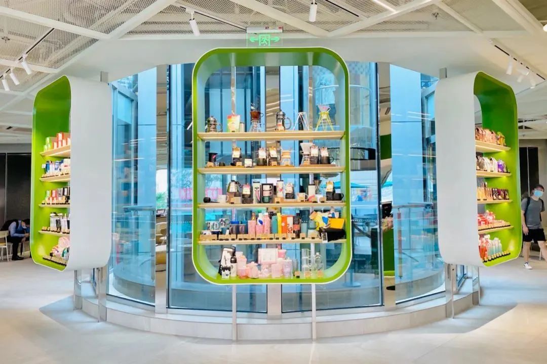吧臺顏色使用嫩綠色代表咖啡豆的種植概念,產(chǎn)品陳列柜設(shè)計也很特別,統(tǒng)一圓角造型,很有親和力。