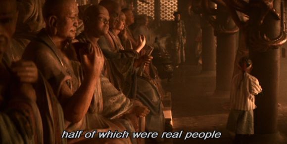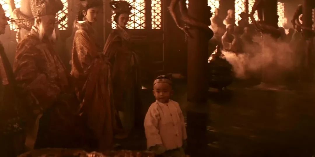 片中的剛被欽點的小溥儀自顧自離開母親,來到了一個仿若陰間的場所。這個理論上應是慈寧宮的地點竟然煙霧繚繞,數十宮女太監著詭異袍服垂手而立。