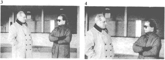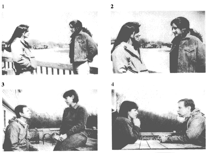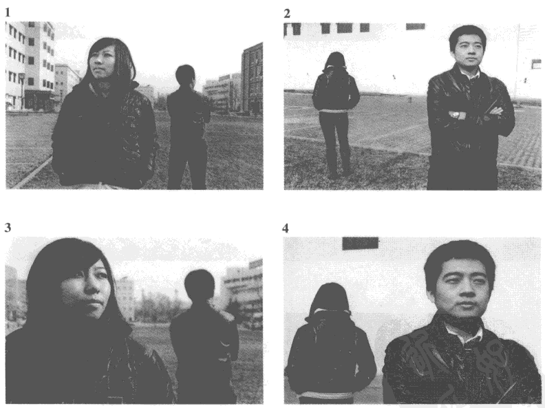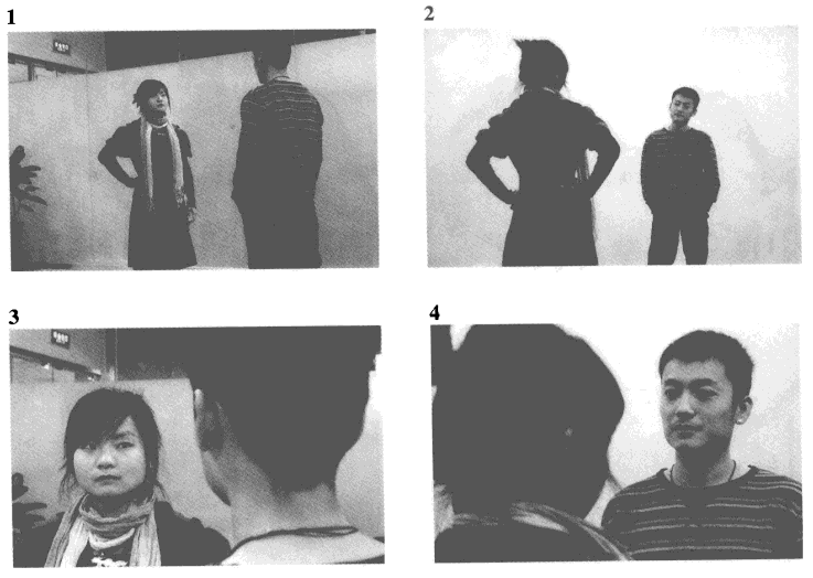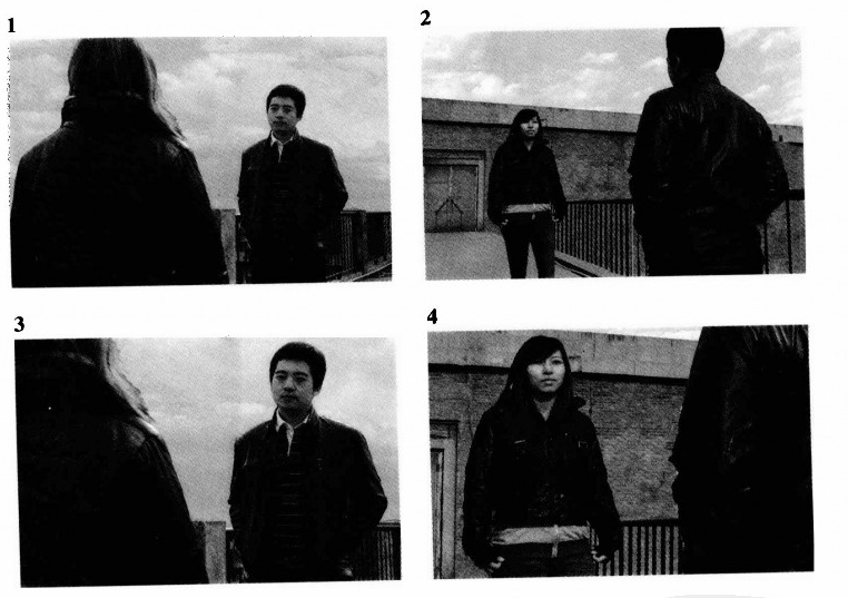 雙人對話最基本的位置就是面對面,肩膀互相平行。這種拍攝方法是從側面拍人物,就構圖上而言,這種調度會使人物產生強烈的對立感。