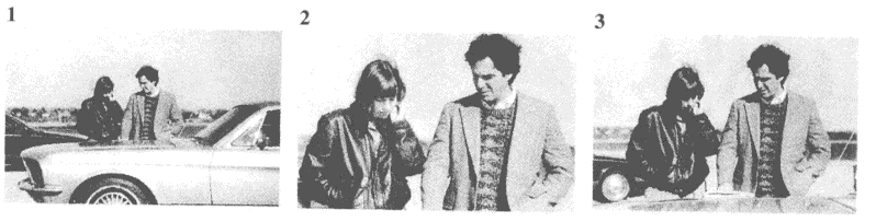 這是正反拍鏡頭的另一種模式,也被稱為過臀鏡頭。極具動感的低角度鏡頭,容易營造敵對關系。圖1和2只是輕微的仰拍,不如圖3和圖4那樣強烈地分離人物關系。這基本是正面的拍攝位置,而且演員的正臉和側臉可以同時出現在一個畫面中。比如下圖中,演員面向前方,看著車蓋上的地圖,但他們說話時,就變成側臉對著攝影機。畫面1-3是明顯的雙人鏡頭,你會發現景別的大小會影響場景的觀感。這個調度把人物安排成90°角的位置,人物間的關系比較輕松,因此演員不必相互對看,頭的位置也不一樣。