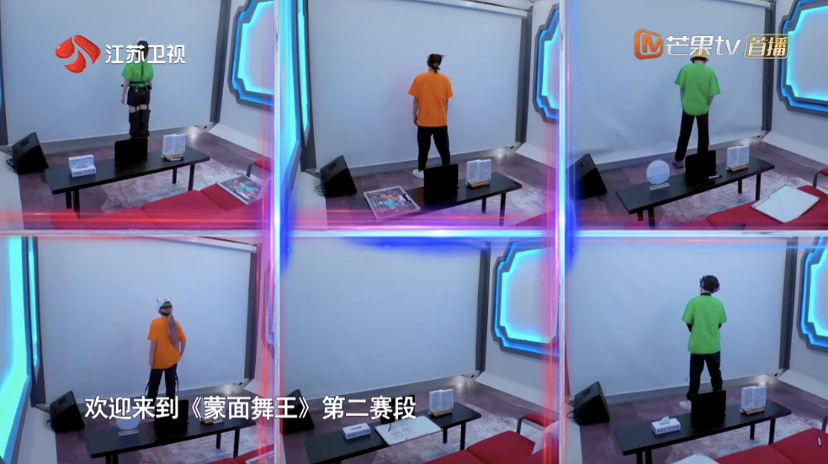 首先,節(jié)目一開始的真人秀部分,舞者仿佛置身一個(gè)競(jìng)技場(chǎng),只能透過(guò)玻璃房看到對(duì)手的標(biāo)簽和個(gè)人技展示,為自己挑選對(duì)手;而后兩兩對(duì)戰(zhàn)后的“半揭面”環(huán)節(jié),通過(guò)卸掉面具的一個(gè)部位,為觀眾揭曉一半的懸念。這些小設(shè)計(jì),在緊張的比賽氛圍中,為節(jié)目加入了一些有趣的“佐料”,也有助于讓觀眾對(duì)舞者建立起初步的印象。