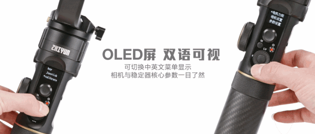 OLED屏可切換中英文菜單顯示,相機與穩定器核心參數一目了然。