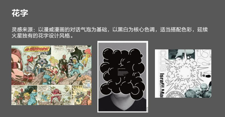 而《火星情報局》主打的,則是漫畫風。以漫威漫畫的對話氣泡為基礎,黑白為核心色調,適當搭配色彩,延續火星獨有的花字設計風格。