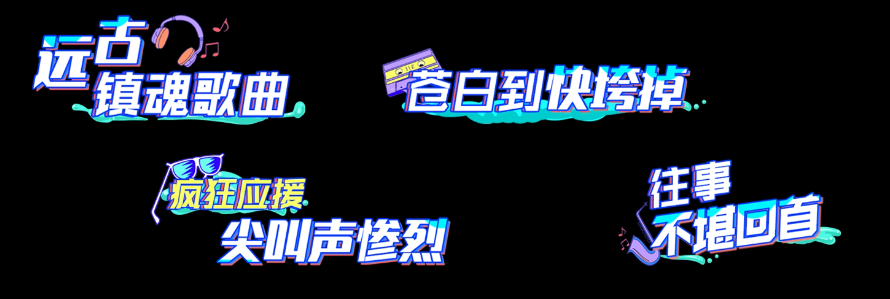 那花字幕有兩類設計,一類是圖形設計,在視覺設計中圍繞一個主導整體視覺的元素。例如《快樂大本營》音樂季,以樂器為設計元素,增加歡樂的潑墨設計,配色主藍色調,搭配橙色,黃色等。整體風格主打簡約青春、活潑,體現節目的音樂性和青春,積極的娛樂精神。