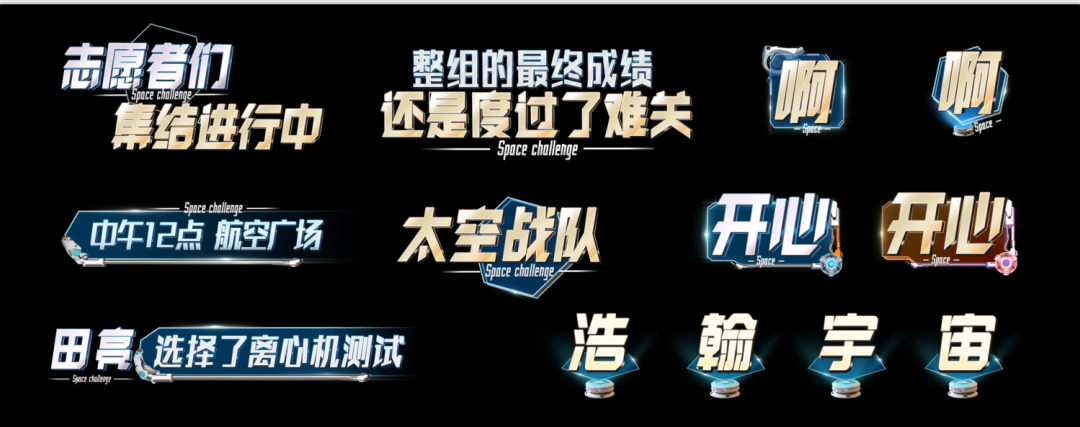 花字幕設計另一類是風格設計,以風格為主導進行設計。例如《挑戰吧!太空》的花字設計走的就是機械科技風,使用科技屏質感為底板,主元素采用logo的主形狀六邊形發散,添加LOGO上的金屬感,更貼合節目性質。風格主打簡約大氣,避免超娛樂化設計,顏色主要采用金屬藍,香檳金,整體提升節目的畫面質感。
