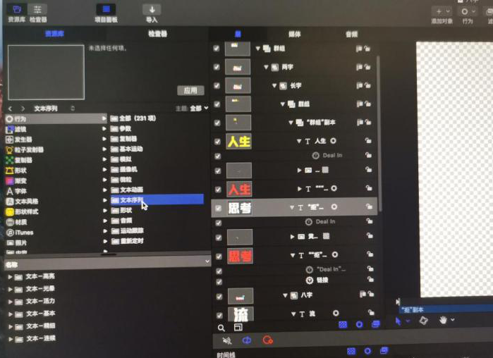 字做好以后,如果花字板式設計有雙層,我們就需要把這兩層放在一個組里。然后選中下面一層字,點資源庫—行為—參數—鏈接,把第一層的字鏈接到下面一層字,再把行為改成文本,改字的時候兩層字就可以一起變動了。字幕模板做好之后就可以來做動態了,以這個模板為例,做預設動態,打開資源庫—行為—文本序列,文本序列里面有很多種預設效果。