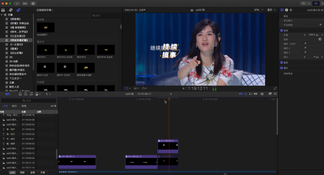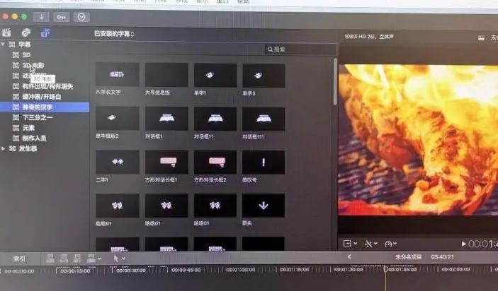 在Motion5里面把字幕做好之后,再打開我們的Final Cut Pro X,點擊字幕器,就會看到我們在Motion5里面做好的動態模板啦!在Final X里打開一段視頻,直接把做好的動態拿來改字就可以使用了,非常的方便。