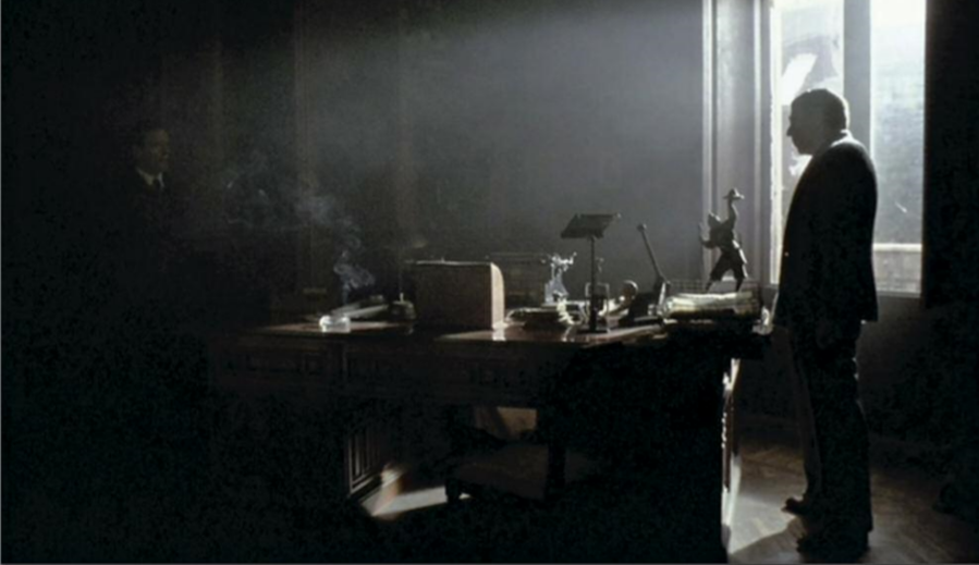 《同流者》的這場戲里,馬塞洛為了讓教授夸德里(恩佐·塔拉肖)想起自己曾說過的柏拉圖的洞穴寓言,拉上了窗戶上的百葉窗,讓房間陷入濃重的暗影中