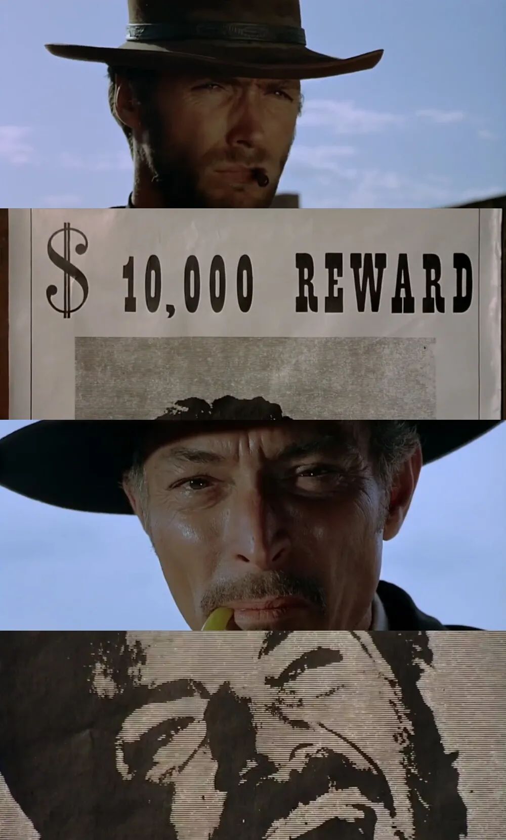 在《黃金雙鏢客》的片段中,通過選擇不同的鏡頭,展現(xiàn)出了兩種不同的情緒。一個(gè)角色看向懸賞令,在他主觀鏡頭中所看到的是賞金,這樣處理是因?yàn)樗胍獔?bào)酬,然而在另一位角色的主觀鏡頭中,他的關(guān)注點(diǎn)是罪犯的眼睛,因?yàn)樗胍獔?bào)仇。