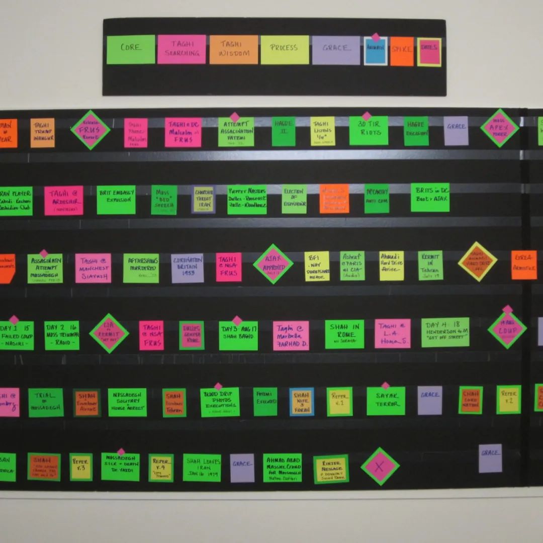 我自己的習慣是,準備一塊一米高,一米二寬的軟木板,然后把每場戲起一個幾個字的小標題,做成小卡片,每剪一個版本就把這些小卡片按順序釘在木板上,這樣一目了然的能夠看到全片的結構。每剪一版就把這些小卡片重新排列一遍,刪掉的戲就是剩在手里的小卡片。猶如一把撲克牌,時刻考慮著,如何把好牌再出手,或者永遠棄之不用。這種土辦法尤其適用于,場次特別多,人物關系特別多的片子。