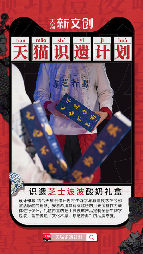 設計理念結合天貓識遺計劃將生僻字與非遺技藝在今朝激活喚醒的理念,安慕希用具有穿越感的月光寶盒作為載體進行設計。禮盒內置的芝士波波球產品定制全新生僻字包裝,旨在傳遞“文化不息,球芝若渴”的品牌態度。