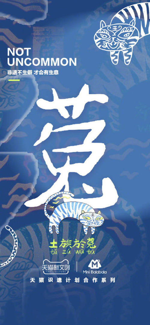 設計理念: Minibalabala邀請了小小藝術家王彥茜主導本次[土族於菟]非遺圖案設計。結合傳統的圖騰文化,創作了兩個憨態可掬的虎豹神獸,從小朋友的視角生動詮釋了生僻字的內涵。通過對民族傳統文化的二次創作,希望讓更多的人認識并喜愛中國傳統文化。