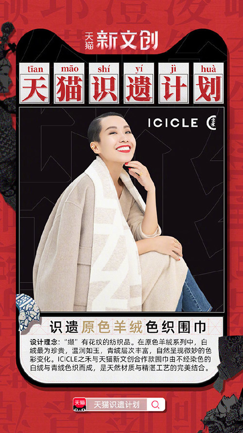 設計理念:“纈”有花紋的紡織品。在原色羊絨系列中,白絨最為珍貴,溫潤如玉,青絨層次豐富,自然呈現微妙的色彩變化。 ICICLE之禾與天貓新文創合作款圍巾由不經染色的白絨與青絨色織而成,是天然材質與精湛工藝的完美結合。