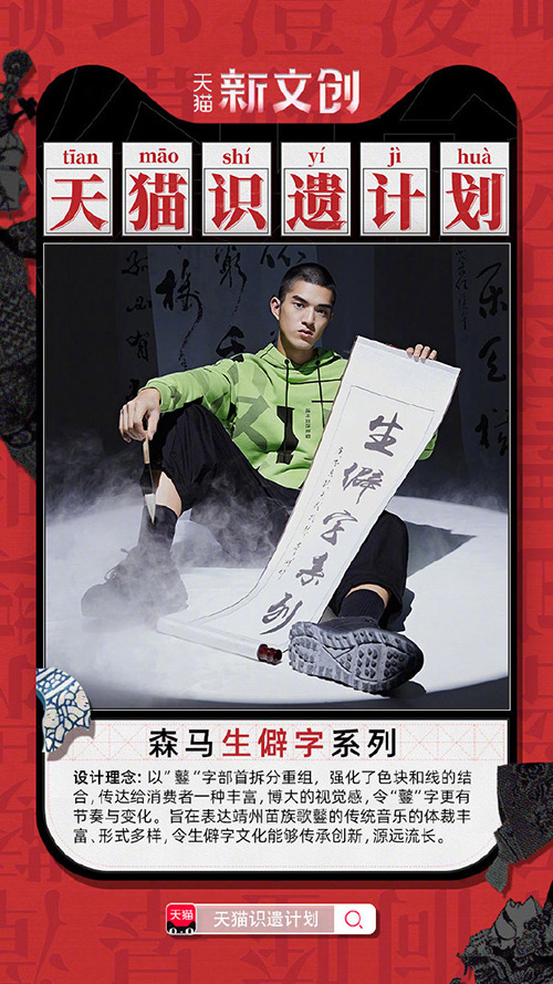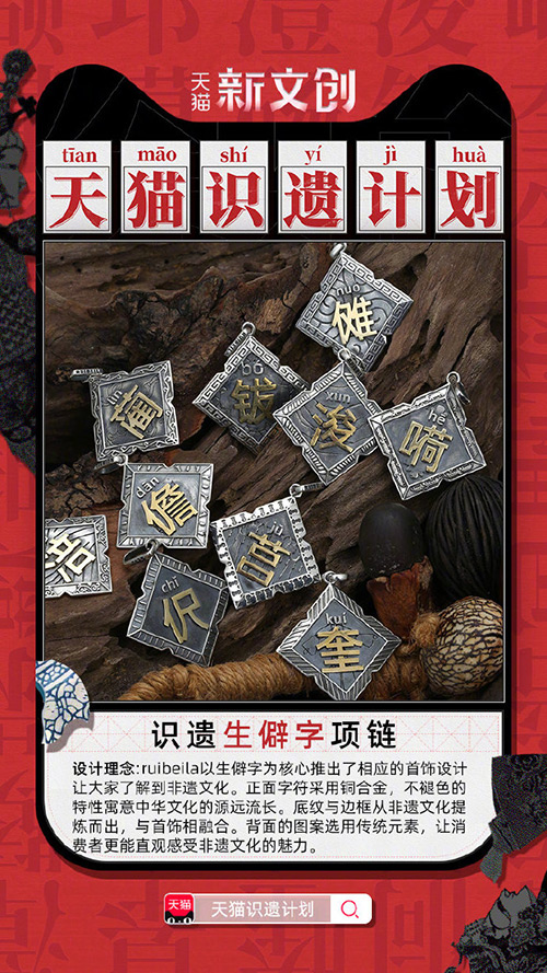 你知道每年有多少非物質文化遺產因為生僻字的原因正在慢慢消失嗎?天貓新文創發起《天貓識遺計劃》,聯合眾多品牌發起對生僻字非遺保護,將這些生僻字非遺技藝,用說唱、潮流單品等年輕化的形式再次包裝,藝術化呈現給世人。非遺不生僻,從認識這些生僻字開始。