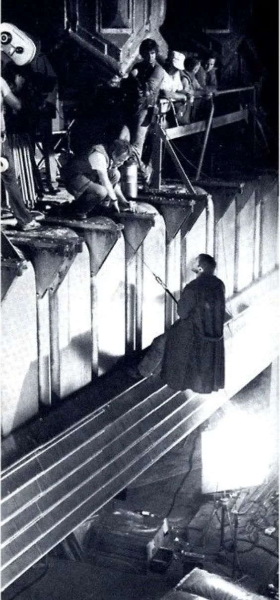 出于種種原因,特技攝影總監之一的大衛?德賴爾在大多數場景的制作中總會和黑白洗印打交道,他甚至希望電影能以黑白的形式放映,因為他認為黑白版的《銀翼殺手》似乎更有深度、更具風格。當然,這不是說克羅嫩維斯的工作有任何問題,而是指,《銀翼殺手》的影像風格其實是一種令人懷舊的表現形式。正如影片的其他方面,克羅嫩維斯將經典影像的攝影傳統進一步發揚光大,為此,他甚至對色彩進行處理,在通常被認為會有顏色的地方,卻讓顏色消失。“我們使用反差、逆光、煙霧、雨還有閃電來賦予影片個性和情緒,”克羅嫩維斯說:“街道被描繪得極度擁擠,這是為了給觀眾一種關于未來時空的印象。我們讓街景填滿人…像蟻群一樣。索性,我們讓他們看起來也像螻蟻——所有人都一樣。這些人形成人流,像在繞圈,又像在漫無目的地走,在這個意義上,這些人都是相同的。而在攝影上,我們則將他們處理成無色。”既然街上的群演都是無色的,那么洛杉磯街景的布景重點就在于突出角色,以及各式各樣的霓虹燈構成的街頭光線氣氛。我們從《舊愛新歡》[1981,維托里奧?斯托拉羅攝影]劇組借來大量霓虹燈,為了讓畫面看上去真實可信,畫內霓虹燈的調壓器通常被設置為光線出現頻閃以前的數值,同時,畫外的霓虹燈則盡可能開到最亮,以作為主要的[環境]光源。當現場的霓虹燈不足以照明,或無法起到裝飾效果時,我們會立刻做些新的,并放至我們想要的位置。一個例子是,我們要在德卡(哈里森?福特飾)跑過的路邊陳設[霓虹]字母,還要在巴士里貼燈條,當時我們有個7人小隊,不干別的,就專門負責這些霓虹燈。因為它們的數量遠遠超過了現有的調壓器,因此,拍這場戲時,我們總是在拆東補西。克羅嫩維斯增設霓虹燈有其理由:“我們需要一些光線上的重點來突出影調,必要時讓街景燦爛奪目,以及突出物體或角色。使用逆光結合環境[氣氛]光來照明場景,實際上不難理解。”現場的霓虹燈足夠亮,讓克羅嫩維斯得以拍攝一些高速鏡頭:“在德卡追捕‘蛇女’復制人若拉(喬安娜?卡西迪飾)的段落中,劇本需要她沖向一連串的玻璃櫥窗。美術指導搭好符合這一動作的店鋪,但是到了裝飾階段,雷德利卻對第一次的結果不滿。美術組將所有裝飾撤走,并在一周后提交了新的方案,可是雷德利還是不喜歡。最后,老雷自己想到個好主意,他取走一些街景上的霓虹燈,并把它們放進櫥窗,結果證明效果很好。接著,我們以多機位、不同幀率拍完了整個追逐——有正常鏡頭,也有升格鏡頭,這造成一種脈動般的效果,這種情況不會出現在正常幀率下,但是以高幀率拍攝就會特別明顯。我們認為脈動也是這場追逐戲的元素之一,因此順理成章地接受了它。”另一個例子是對色光的大膽使用,在場景“塞巴斯蒂安的玩偶屋”中,期間,德卡碰到了另一個復制人普瑞斯(達麗爾?漢納飾)。普瑞斯臉上鋪滿白色粉底,整個場景則氤氳在玫瑰[粉]的光線之中。色光偶爾也被用來給復制人的眼睛創造一種特殊效果:“辨別復制人的特征之一是他們的眼神帶著一種異常的發光感,”克羅嫩維斯說:“為了實現這種效果,我們使用了一種雙向鏡子[two-way mirror]——50%的透光率,50%的反射率——并把它以45度角放在鏡頭前,然后對準鏡子射出光,讓反射回來的光線順著鏡頭光軸與眼睛疊到一起。我們有時使用非常輕微的色紙給眼睛增添色彩。通常情況下,我們會同時拍攝有和沒有這種效果的鏡頭,這樣雷德利就知道他到底用還是不用。”然而,探討《銀翼殺手》的攝影,克羅嫩維斯卻強調說技巧并非最重要的考量。“《銀翼殺手》在攝影上的獨特之處不在于用了什么設備、色紙,或者光有多硬又有多柔,”他強調說:“而在于每一次敘事背后的觀念。既然影片的背景設定在未來,那么一些特殊光源就得以出現在現實生活中人們無法接受的位置。比方說,街景上的很多人撐著雨傘,而熒光燈管與雨傘的傘把結合到一起,便成為照亮他們臉的光源之一。”克羅嫩維斯尤其強調逆光與反差。“我從來不會認為逆光太強,”他說:“只是一些導演想看清演員的臉,而我總是告訴他們,觀眾只會面對性愛場面時需要。”電影攝影師對營造某種情緒或者某種效果的興趣,與為演員打光是一樣。他傾向于用柔和的順光以及硬朗的逆光,雖然如此,他補充道:“我也很喜歡臉上過曝的硬光,我覺得它們很美,與眾不同,令人興奮,甚至有那么一些生猛。”“《銀翼殺手》是一部追求極致的電影,自然也是極致光影的集合,它是戲劇性的[光效],但在影片里卻異常真實,我相信你們可以接受,因為,它已經超越了戲劇性本身。”除了使用柔和的正面光,克羅嫩維斯也經常從低角度為人臉照明。除了發光的傘把,在某些場景中,他經常利用水或其他反光面來制造上沖光[uplight,腳光屬于其中一種]。對前景使用柔和的上沖暖光,而對后景使用硬朗的逆光并配合煙霧,這種組合可以說是《銀翼殺手》中最為典型的照明特征。《銀翼殺手》在攝影上的另一個重要元素是對光束的使用。“這是我與雷德利都有想到并討論過的點子,”克羅嫩維斯透露說:“我們交流了想法,之后光束成為這部影片的攝影主題之一。我們以不同的形式,反復加以利用。為了讓光束不斷在電影里出現,我們設計了一些在夜空中巡游的飛船,它們的底部發出非常強勁的光束。在未來的生態中,飛