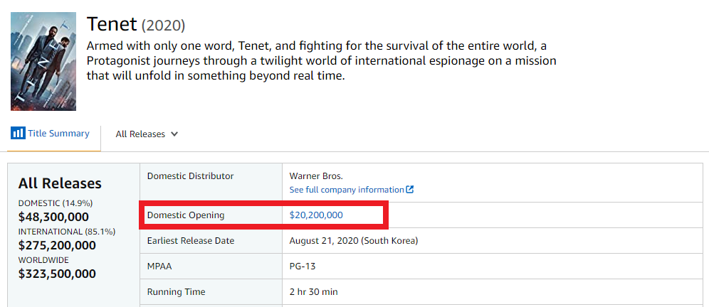 目前仍在上映的《信條》全球累積票房達到了3.2億美元(美國票房為4800萬美元),在疫情的大背景下,《信條》已經做到了最好,但分析師Jeff Bock表示,“這可能還遠遠不夠”,據數據顯示,《信條》的成本達到了2億美元,是諾蘭所有電影中成本最高的一部,而加上后續的宣傳營銷等預算,《信條》最少需要 4.5億美元的票房才能實現收支平衡。Bock補充到,在以往正常年份,《信條》的票房可以很輕松達到7億美元,也就是現在的2倍還要多。
