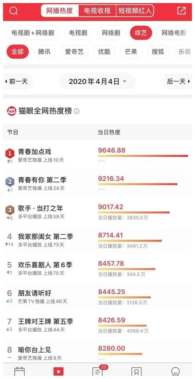 一方面,衍生節(jié)目在內(nèi)容和形式上擁有不小的發(fā)揮空間,既有深度訪談、生活記錄,也有競(jìng)技游戲、互動(dòng)娛樂(lè),實(shí)現(xiàn)了對(duì)不同圈層用戶(hù)的精準(zhǔn)投放。在正片影響力的加持下,往往表現(xiàn)出不俗的引流能力。今年4月,《青春有你2》的衍生節(jié)目《青春加點(diǎn)戲》,熱度曾一度超過(guò)正片,拿下了貓眼綜藝全網(wǎng)熱度榜榜首。