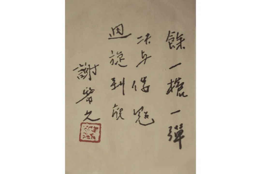 謝晉元手書:余一槍一彈,決與倭寇周旋到底。據(jù)說是當時新聞記者進入倉庫想采訪,謝晉元因在指揮不便相見,連長雷雄將謝晉元寫的紙條交給記者。