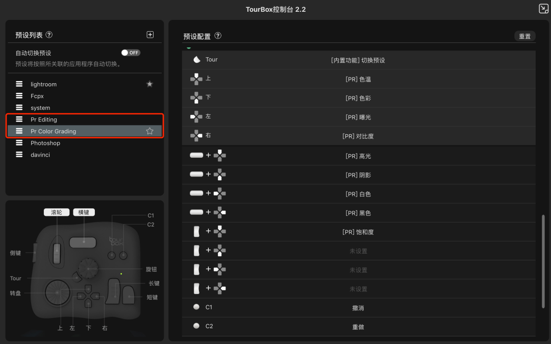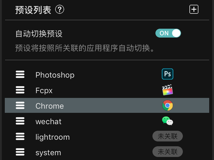 這在精細調整時,尤為好用。同樣的旋轉幅度,“低速模式”對參數、幀數等的改變較小。如果你同時使用多個軟件,PS、Lr、FCPX等等,可以打開“自動切換預設”的開關,TourBox會跟隨你正在使用的軟件,自動切換對應預設。
