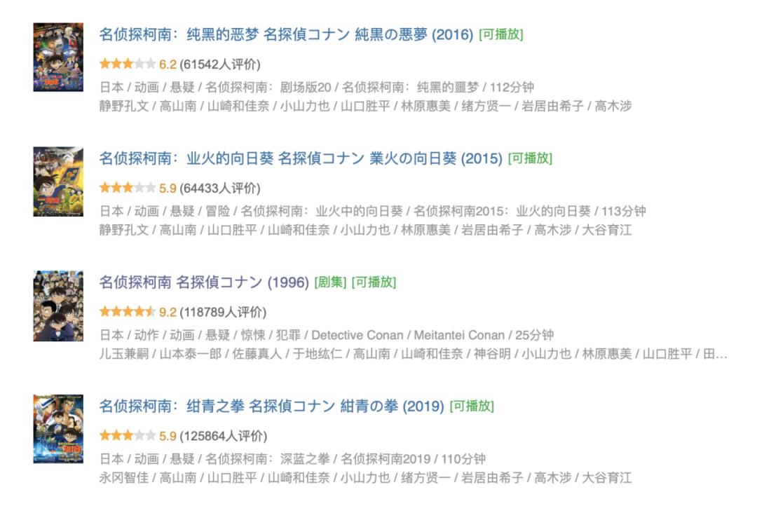 更讓人意外的是部分影片口碑遇冷,同樣以《名偵探柯南》為例,在2002年《貝克街的亡靈》獲得9分之后,劇場版的口碑每況日下,近幾年更只能在及格線徘徊。