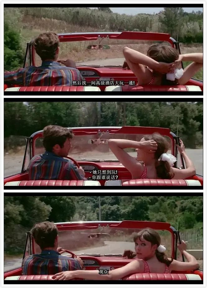 以演員為例,無論是何種方法的表演,你總能看到電影角色背后的人(演員),演員不可能在表演時完全消解掉自我。戈達爾不僅承認這一點,他還會利用演員在她臺詞上的失誤,他會在影片中可以保留喊“開始”前幾秒的鏡頭,因此觀眾就能意識到導演和演員之間的關系,特別是當演員是他的妻子安娜·卡里娜的時候。