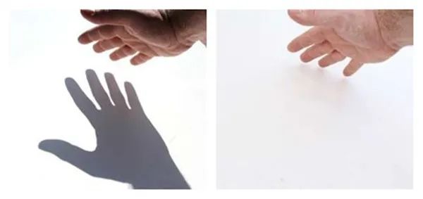 在直射的強烈陽光下,作者的手的影子非常清晰,輪廓分明;而在厚厚的云層下,透出來的光就非常柔和,幾乎無法制造影子。