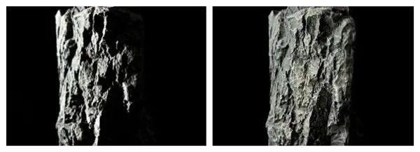示例:硬光和柔光從同一傾斜的側面角度照射在一顆表面紋理豐富的石頭上。注意,硬光會突出紋理的呈現,而柔光則會大大減弱這種效果。