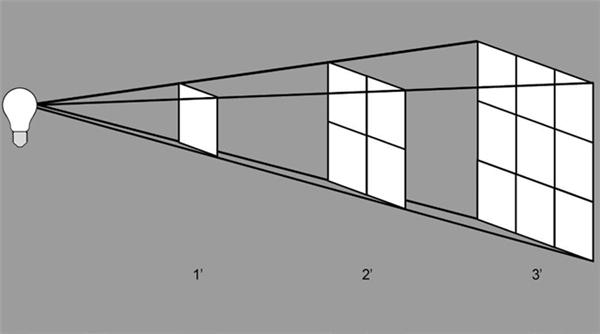 由于光線質量與距離光源的遠近存在直接關系,因此我們就開始涉及到被稱為平方反比定律的物理定律, 該定律指出,在這種情況下,光的能量隨著傳播距離的平方而減少。對于大多數布光專業人員來說,這條定律是用于確定特定距離遠的燈具的光損失。這對于確定在特定環境下某個燈具產生的光線強度來說,是一個很好的公式。