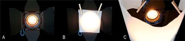 示例:夾在一盞 650 瓦 Arri 菲涅爾燈上的柔光紙。柔光紙幾乎無法增加光源的面積或改變光線質量。然而,離光源有一些距離、夾在遮光罩上的更大的柔光紙開始通過增加光源尺寸來改變光的質量。