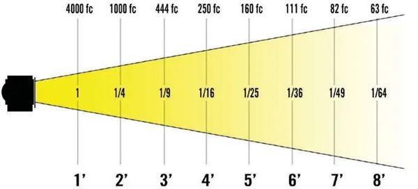 查看一些燈具的光度測量圖,會發現一盞典型的1K 敞口式燈具,如果放在 4 英尺遠的地方,光強會達到 1000 英尺燭光。如果我們把這個距離增加到 8 英尺,燈光強度就會下降到 250 英尺燭光。距離增加了一倍, 但燈光強度只剩下原先的 1/4(或者說距離的平方反比)。