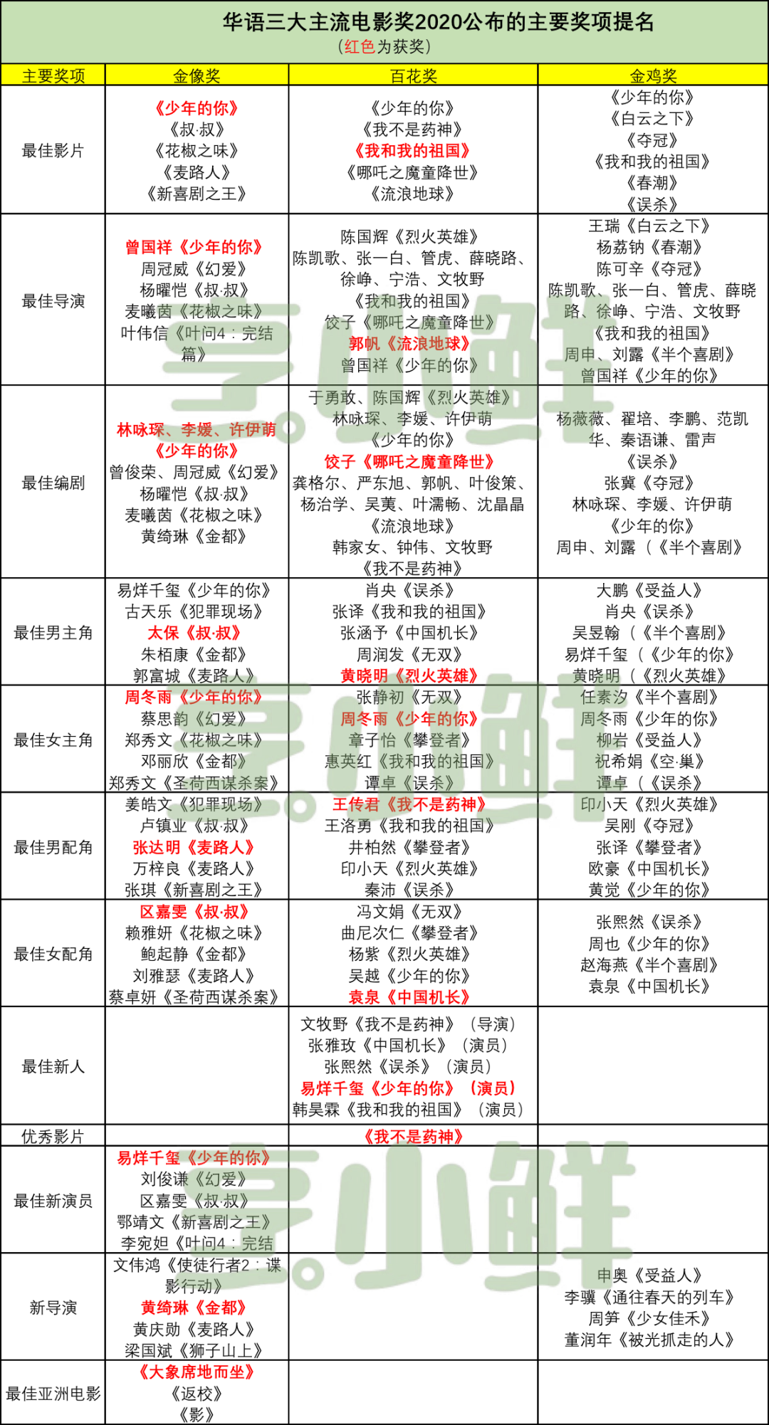 結合金雞獎,本年度舉辦的大多數華語電影獎(非電影節類)已揭曉了認可的片單。對此,我們統計了三大主流獎——香港電影金像獎、大眾電影百花獎、中國電影金雞獎的終極入圍名單,以此觀察近兩年的行業情勢。盡管它們的參評范圍各有不同,但是其共性仍能說明主要現象。