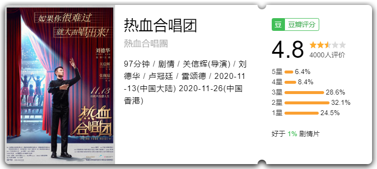 在作品和人氣的加持下,劉德華已持續多年產出票房爆款,對于觀眾而言自然對其新作報以期待,而就在今年受疫情影響亟需強片救場的時候,不久前上映的《熱血合唱團》不僅沒能復制劉德華此前作品的成績,反而面臨票房口碑雙雙失利的結果。《熱血合唱團》的失利自然與影片質量相掛鉤,但追根溯源還與影片被迫囤積多年的遭遇有關。