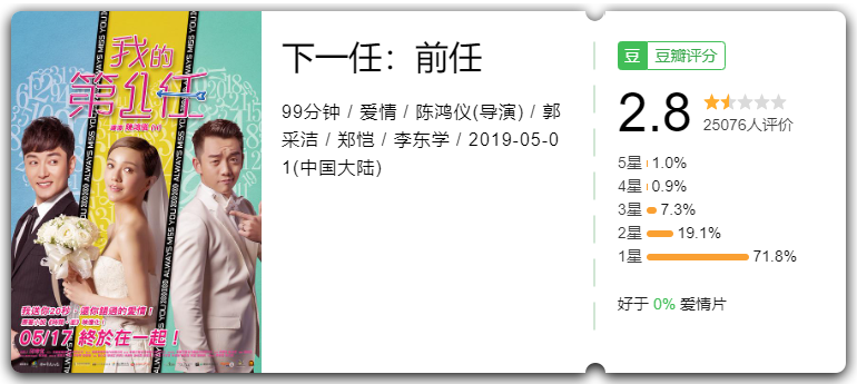 去年5月,由劉昊然主演的電影《雙生》上映,影片早于2016年就殺青并計劃同年上映,后因主創在創作上產生分歧,導演意愿與最終剪輯版出入較大,最終不得不多次重剪,檔期也一再推遲,最終淪為“囤積片”,上映后普遍被批評為“影像風格過時”,最終僅在豆瓣上收獲了3.5分的差評。同年上映的另一部電影《下一任:前任》也面臨著同樣的境地,影片于2015年就已拍攝完成,但期間經歷換角、補拍、改名等風波最終積壓了4年才重見天日,上映后毫無例外地遭遇了口碑滑鐵盧。