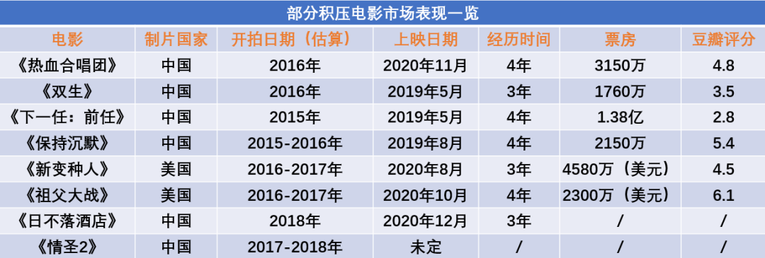 可以說,疫情讓“囤積片”的概念再次受到業界廣泛關注,然而疫情屬于不可抗力,其所造成的影片大量囤積情況與通常業界所定義的“囤積片”并不相同。在此之前,市場上曾有過不少因為影片自身原因而多次延期的情況,當這些“囤積片”最終走向市場,無一例外都面臨著和《熱血合唱團》一樣撲街的命運。