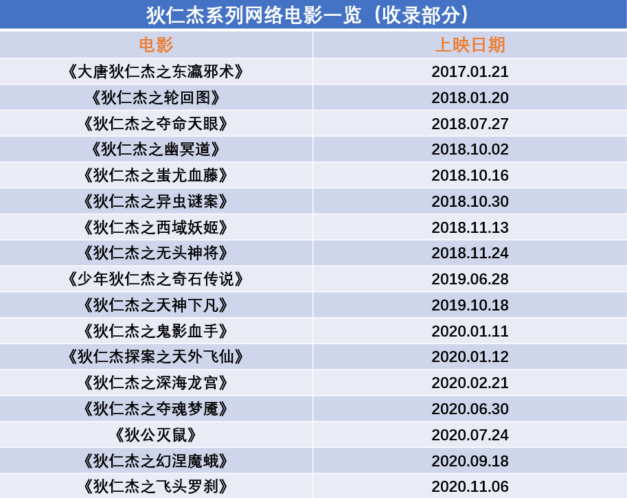 據(jù)統(tǒng)計(jì),僅在2020年,就有《狄仁杰之鬼影血手》《狄仁杰之深海龍宮》《狄公滅鼠》《狄仁杰之飛頭羅剎》等近10部電影上線,而今年已備案或即將開拍的《狄仁杰》系列電影也達(dá)到了20余部,可以預(yù)見的一點(diǎn)是,未來一段時(shí)間內(nèi)“狄仁杰”掀起的熱潮仍然會(huì)在網(wǎng)絡(luò)電影界持續(xù)。