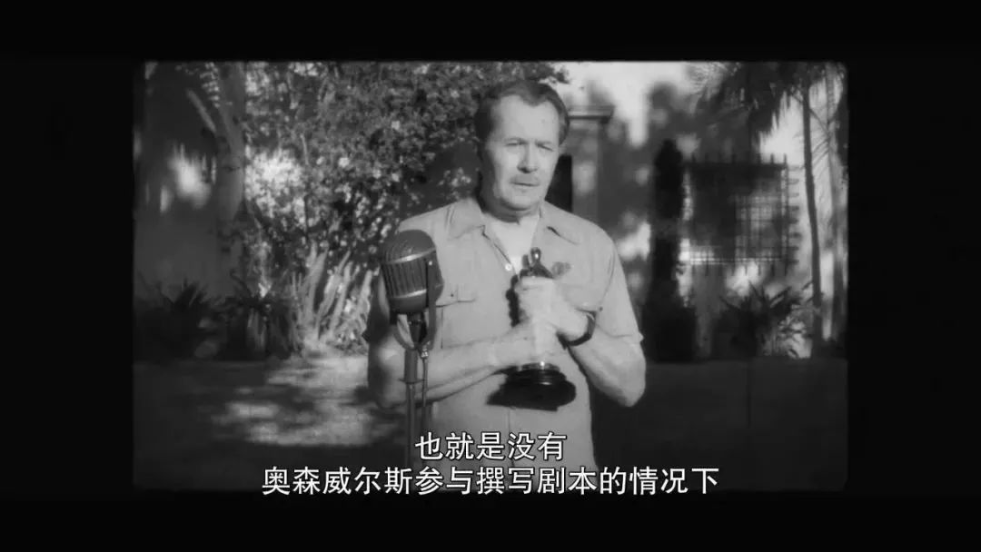 另外一個問題是,他與奧森·威爾斯簽定的合同規定了他沒有劇本的署名權,他清楚地知道這個劇本是一個杰作,他想得到署名的機會,于是和奧森·威爾斯展開談判。最終他得到了第一署名權,并獲得了奧斯卡最佳編劇獎。這個情節在影片中并未過多著墨,而實際上他們二人因為署名權曾經鬧得不可開交。
