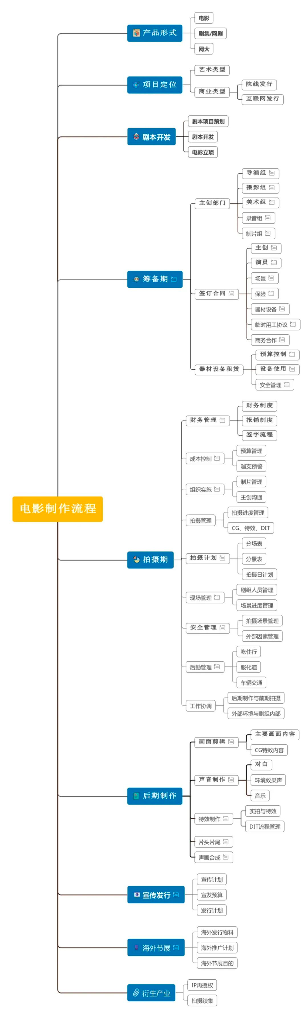 在一個項目中,制片人需對整部電影的制作全流程(參考下方導圖)有最基礎的了解,以便在項目推進過程中,各部門之間可以打一個非常專業且高效的配合。