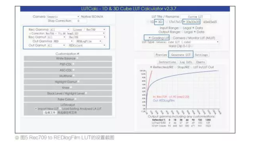 LUTCalc 中預置了現在主流攝影機的色域、Gamma 曲線、 Rec.709 標準等參數。 經過作者的測試, LUTCalc 完全可以用來制作 Rec.709 to Log類型的 LUT, 可以滿足一般制作的需要。 圖 5 為制作Rec709 to REDlogFilm LUT 的設置截圖。