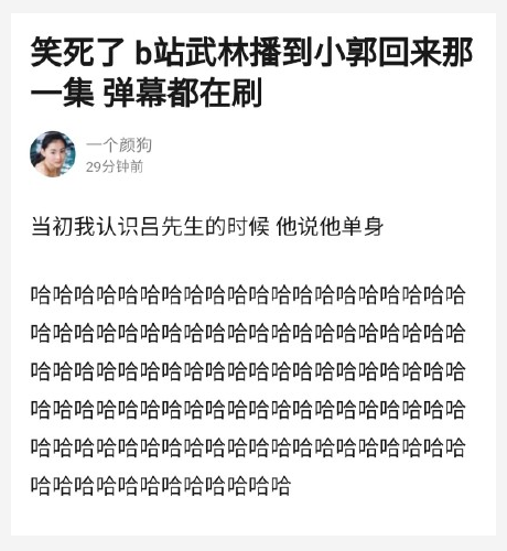 在去年,央視b站官方賬號“小央視頻”每晚7點準時直播5集《武林外傳》,循環播放將近6遍,同時在線的觀眾常常超過10萬。許許多多的“腐竹”(《武林外傳》粉絲的自稱)將它當做最好的一部國產情景劇,反反復復觀看,從中發現新的東西。許多人還和網友 @songyang 一樣,把它當做居家的BGM“聽著睡覺,吃飯、做家務、玩手機時都離不開”。