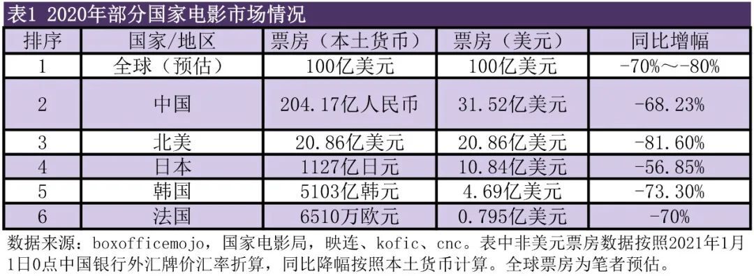 電影誕生125年以來,人們恐怕從未如2020年這般感受到電影是人類命運共同體的重要組成部分。中國電影市場全面關閉178天,即便在抗戰時期民族最危難的時刻,都沒有遇如此艱難。美國電影業的長期停擺,直接導致幾大電影市場損失三分之二以上票房;各國電影作品和影人交流的不暢,也使得各種文明間的對話變得暫時疏離。在人類文化的新發展中,電影起著非常重要的核心作用。疫情不會是人類、也不會是全球電影面臨的最后一次危機。電影唯有以2020年的挑戰為新的出發點,應對疫情、國際矛盾、地區沖突、全球治理體系和國際秩序等前所未有的挑戰。2020年,全球影市受疫情影響降幅明顯。全球電影票房約為100億美元,同比下降約75%。有相關研究表明,在影院感染的幾率低于餐廳用餐等公共活動。但世界各地的影院遭遇了或短或長的停業。疫情發生后,許多國家和地區采取了減免稅收、工資補貼、失業補償、貸款和金融擔保、減免租金等一攬子幫扶政策。各種電影節展取消、延期或轉為在線舉辦。疫情對電影業的改變是電影誕生125年來最大、最無可想象的。美國恐怕是票房同比全球跌幅最大的電影大國,下跌81.6%。日本電影市場全球受損最輕,報收1127億日元,跌幅為56.85%。作為全球第四大票房市場,韓國疫情爆發較早,電影業受影響也較為嚴重,觀影人次僅為6000萬人,票房折損73.3%(數據來源:kofic)。在疫情未受控制前提下,全球各電影大國采取的措施無法改觀影市困窘。法國影院共關閉了176天,制片業受損不輕,票房排名前十的影片,只有排名第6的《杜可布3》、排名第9的《沒有媽媽的十天》和排名第10的《最多30天》是法國出品。法國政府對電影行業的支持也是力度空前:文化部向電影行業所有領域提供3.2億歐元補助;重振經濟計劃中的1.65億歐元用于補貼影院,預計每塊銀幕補貼3萬歐元;另有專項基金3400萬歐元用于支持電影發行放映,其中3000萬歐元用于補貼影院,200萬歐元支持藝術院線。意大利影院3月起關閉,從6月15日起恢復營業,政府補助電影產業1.3億歐元。英國最大院線Cineworld已經于此前關閉了128家影院。因中國政府快速有效控制疫情、優質影片較多、影市恢復好于預期,中國成為全球第一大票房市場。尤其是全年銀幕建設逆市增長。新增銀幕5794塊,全國銀幕總數達到75581塊,銀幕總數同比增長7.67%,銀幕增速8.3%。這是2003年電影產業化改革以來銀幕增速的最低點,也是增長最為艱難的一年,更是增長成績最值得驕傲的一年。它顯示出即便在遭受重創之下中國電影的勃勃生機。中國市場2020年成為好萊塢影片主要海外市場甚至是主要市場。新上映的多部進口影片收入占該片國際市場收入較大比重,甚至超過北美本土票房,如《瘋狂原始人2》《花木蘭》等影片占其海外市場50%以上。中國市場在復工復市期間的種種探索,將成為全球有益經驗;作為全球第二大市場,全面停擺半年之久的中國電影市場,其快速復蘇更大幅提振了全球電影市場的信心。但也應認識到,中國電影離真正成為全球范圍內最強有力的電影市場,無論從產品品質、銷售渠道暢通多元、還是從競爭規則整備有效等方面,都還有較大進步空間。2020年,北美電影市場綜合票房報收20.86億美元,同比下降81.6%。共上映影片455部,比2019年上映影片數911部下降了50%(數據來源:https://www.boxofficemojo.com/year/ref_=bo_nb_hm_secondarytab.)。有96%的影院報告蒙受逾70%的損失,有70%的影院申請破產或永久關閉。此前美國電影院提供了15.3萬個崗位,但疫情導致7萬個以上崗位的失業(數據來源:NATO)。美國通過了一些幫助中小業主的貸款方案等措施,仍然矛盾重重。AMC自3月16日起關閉1000家影院(北美661家)。由于疫情未能持續減緩,這一狀況并未隨著疫苗研制成功而有明顯轉機。因影院大范圍關閉,自3月起缺乏對票房有帶動性的影片上映,票房較高的影片均為美國疫情全面爆發前的作品。5月,環球影業以20美元的價格推出《魔發精靈2:世界之旅》在線點播,此后三周內該電影獲得的線上收入超過了《魔發精靈1》在影院上映5個月的收入。環球影業并將窗口期縮短至17天。AMC院線因此與環球影業曾因此 “決裂”。但在疫情未獲緩解情況下,AMC與環球影業和解。7月,AMC、Regal等美國多家大型院線將新澤西州長告上法庭,要求新澤西州允許電影院復業。8月7日《派拉蒙法案》被廢止,是北美電影業態發生根本性變革的標志。8月7日,始自1948年、本意為反對派拉蒙等好萊塢大制片廠壟斷而形成的《派拉蒙法案》獲批終止。這一事件順應了電影業態被流媒體平臺和疫情改變的趨勢。8月,迪士尼以30美元點播價格在旗下“Disney+”平臺推出真人版《花木蘭》,直接導致該片全球票房回收困難。11月,全國影院業主協會于呼吁國會和政府通過救濟立法幫助行業度過難關。以馬丁·斯科塞斯為代表的多位著名導演聯合美國導演工會、美國影院業主協會、美國電影協會,公開致信請求美國國會拯救影院。華納將于2021年將17部影片悉數轉至旗下流媒體平臺HBO Max同步上映。擁有4000部影視作品版權的米高梅以市值55億美元(含債務)宣布尋求出售,預示著好萊塢電影市場仍面臨不可知的未來。2020年,日本電影市場估計報收1127億日元(根據https://eiga.com/ranking/相關數據統計),是2019年票房2611.8億元的43.15%,是自2000年日本電影發行、放映體制改革以來票房最低