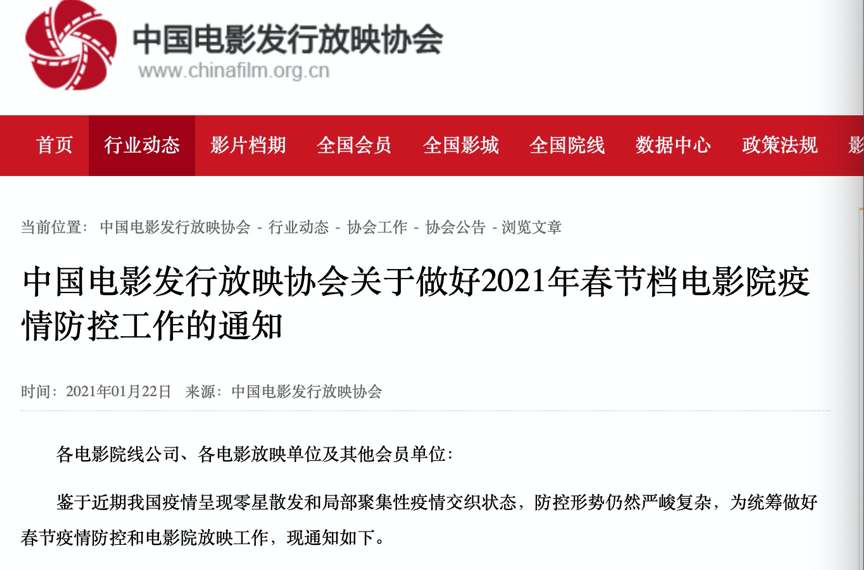 1月22日,中國電影發(fā)行放映協(xié)會(huì)發(fā)布《通知》,要求各單位做好2021年春節(jié)檔電影院防控工作。圈內(nèi)各路小道消息四起,比如全國將全面下調(diào)至50%上座率、預(yù)售將再次延遲、某部片要撤檔、網(wǎng)絡(luò)院線動(dòng)作等等。