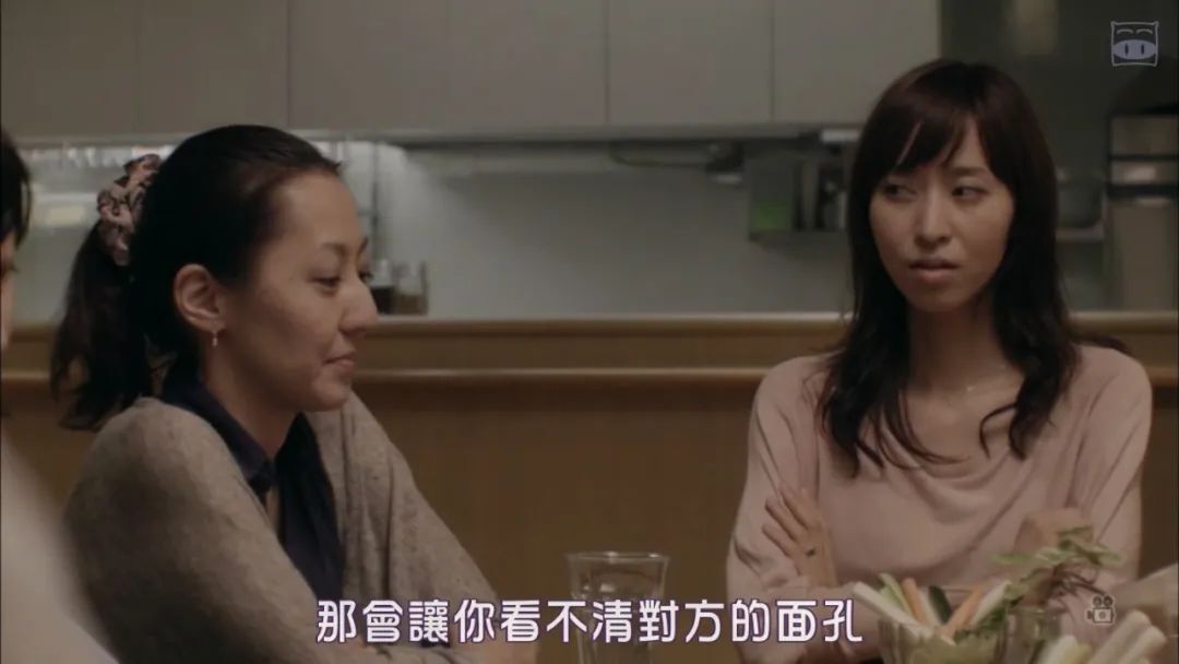 這一段的影像構建方式是“空間—影像—心理”,電影中具體的影像都是人物心理狀態的投射。在拍攝地鐵的場景時,導演常常將鏡頭與人物或是人物與人物運用物理的隔離分隔開,最常見的就是他經常隔著地鐵的門去觀察人物的狀態,這是人物內心孤獨狀態的影像投射。《歡樂時光》中有大量的類似鏡頭,有時人物與人物之間甚至隔著兩座門。在《夜以繼日》中,四個人在亮平家中聚會的段落,甚至在場景內分出了三個空間。亮平等三個人站在左右兩側,而朝子站在廚房中。從構圖上來看,朝子位于最中間的位置,說明了置身事外的位置。